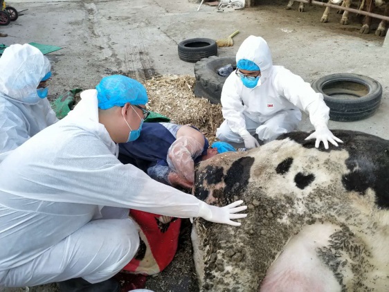 研究生志愿服务团队接到北京周边牛场奶牛难产和未知原因的卧地不起等疑难病情请求后,迅速奔赴奶牛场,经过探诊发现,奶牛出现子宫扭转的现象。经过翻滚的手段缓解了病情,后经子宫探查的手法将犊牛拉出,不断拍打犊牛胸部使其恢复呼吸,最终母子平安。