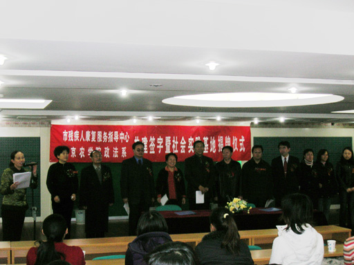 12月1日下午,政法系与北京市残疾人康复服务指导中心签定共建校外实践基地合作协议。政法系将利用学校的智力资源为康复服务指导中心的残障社会工作、社区康复,特别是残障者服务、心理咨询、法律咨询工作的开展提供必要的服务,并对北京市残疾人联合会展开的京郊农村社区残障社会工作提供力所能及的协助,以此为契机,锻炼师资队伍、提高学生的实践能力;康复服务指导中心协助政法系在所属单位建立社会实践基地,为政法系开展社会实践和实践教学活动提供场所和其他必要条件。