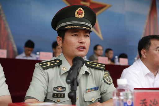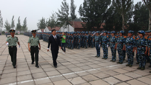 伴着激昂的军歌,郑文堂在军训团团长乔治军的陪同下,对军训学员进行检阅。