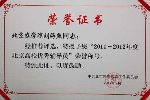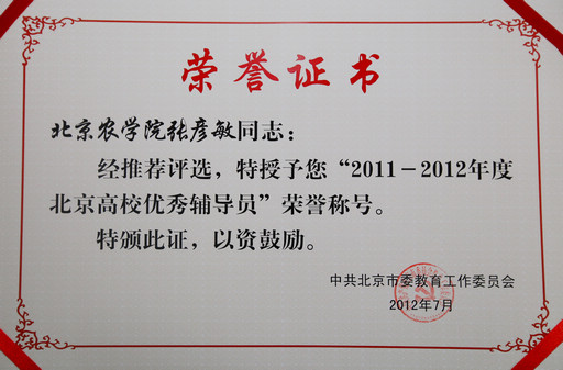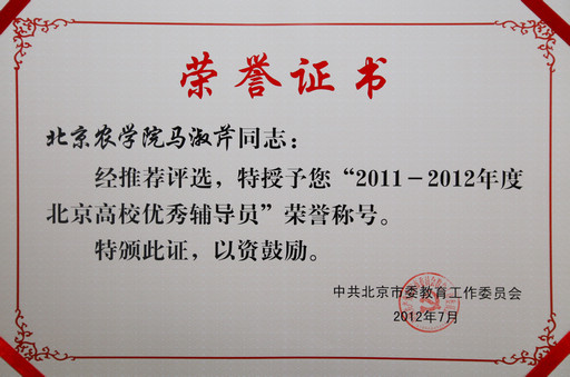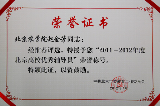 日前,市委教育工委公布了获“2011-2012年度北京高校优秀辅导员”称号的名单,世界杯官网赵金芳、张彦敏、马淑芹、刘海燕被授予“2011-2012年度北京高校优秀辅导员”称号。