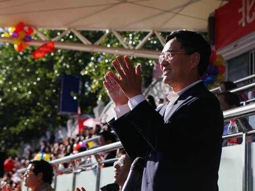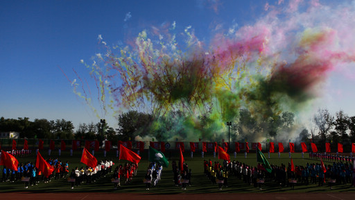 郑文堂宣布运动会正式开幕。五彩烟花瞬间腾空而起,在场运动员及观众响起了热烈的掌声。