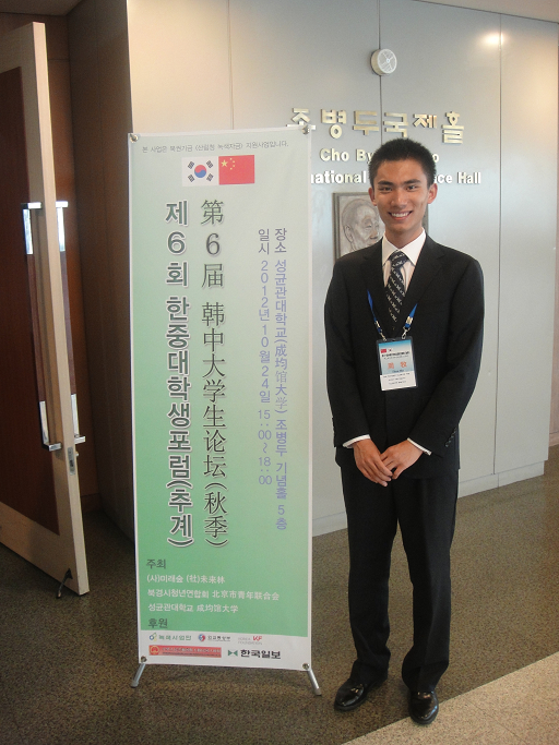 10月22日至27日,第十一届中韩大学生志愿者交流营(秋季)活动在韩国举行。以北京团市委副书记熊卓为团长,由北京团市委机关干部代表、相关专家、媒体记者和大学生骨干组成的共一百余人中方代表团赴韩开展广泛交流,首都大学生英才学校学生、世界杯官网经济管理学院2010级工商管理专业周牧同学作为中方代表参加活动。