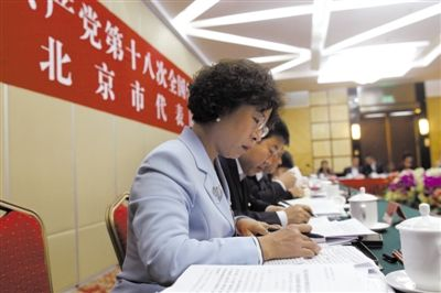 在十八大北京市代表团分组讨论会上,孙素芬正在认真记录。(图片来源:新京报)
