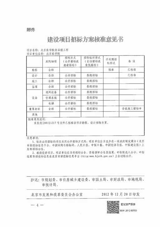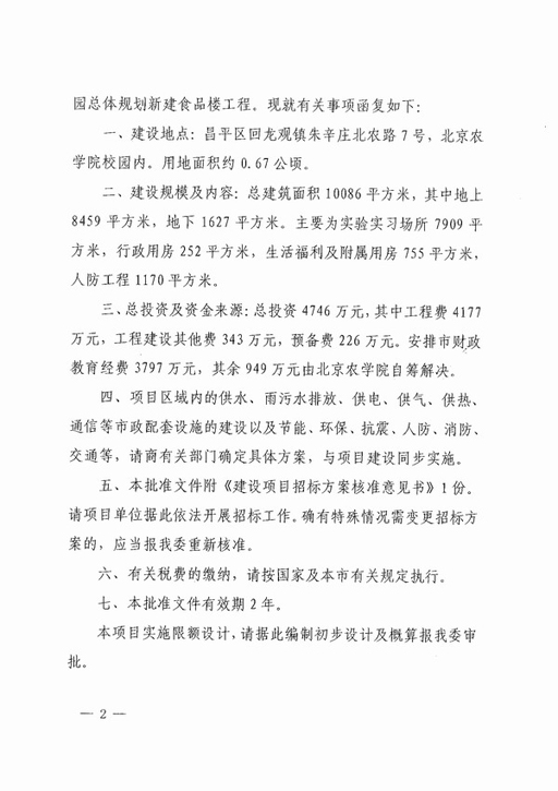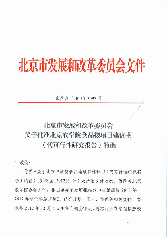 日前,世界杯官网食品楼项目建议书(代可行性研究报告)得到北京市发改委正式批准,项目总建筑面积10086平方米,批准投资估算4746万元(不含减免城市基础设施建设费100万元)。详见京发改【2012】2092号文件。另外,世界杯官网学生活动中心项目建议书(代可行性研究报告)目前也已经通过市发改委项目评估,项目建筑面积3985平方米,投资估算1900万元。