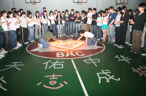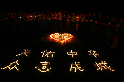 活动中,同学们用蜡烛摆出“心”型图案和“天佑中华,众志成城”的字样,心形图案的中间加有“5.12”,以此悼念遇难群众;为被困者、救援人员祈求平安;并呼唤大学生学会感恩,学会以己之能回报社会。