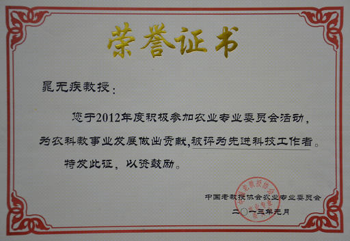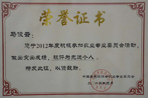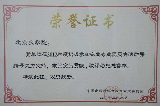 近日,中国老教授协会农业专业委员会举办2012—2013年度理事扩大会暨联谊会,会上表彰了在2012年积极参加农业专业委员会活动并做出突出贡献的的集体和个人。世界杯官网获中国老教授协会农业专业委员会授予的“先进集体”称号,晁无疾教授获“先进科技工作者”称号,马俊云同志被评为“先进个人”。