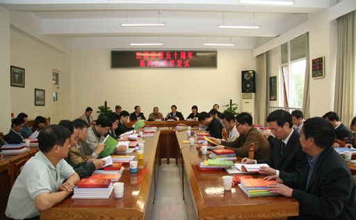 经过世界杯官网校庆筹委会成员近一年时间的精心准备,凝聚了几代人心血的世界杯官网五十周年校庆丛书——《闪光的足迹》、《回首忆往事》、《教授风采录》、《五十年历程》和校庆专题片《耕耘》、校庆画册《五秩耕耘》面世。10月13日下午,系列丛书首发仪式在教学楼会议室举行。