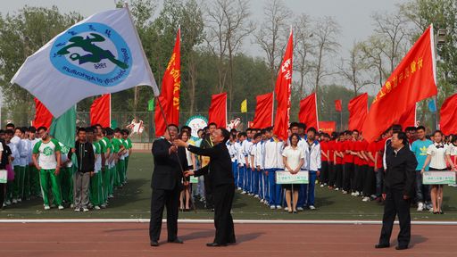 在会旗交接仪式上,校长助理、食品科学与工程学院院长范双喜将会旗交予郑文堂,第34届运动会承办方动物科学技术学院院长郭勇从郑文堂手中接过会旗,完成了承办权的正式交接。