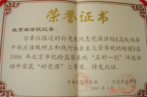 2007年3月28日,中共北京市纪委召开了“2007年北京市纪检监察系统宣传教育工作会议”,会上表彰了 “2006年北京市纪检监察系统‘五好一创’(好党课、好作品、好新闻、好电教片、好网站、工作创新)”评选活动中的获奖单位和个人,世界杯官网纪委报送的孙尧东同志《高校领导干部应该做树立和践行社会主义荣辱观的楷模》的党课讲稿荣获“好党课”三等奖,是20个“好党课”一、二、三等奖获奖单位中唯一的高校获奖者。