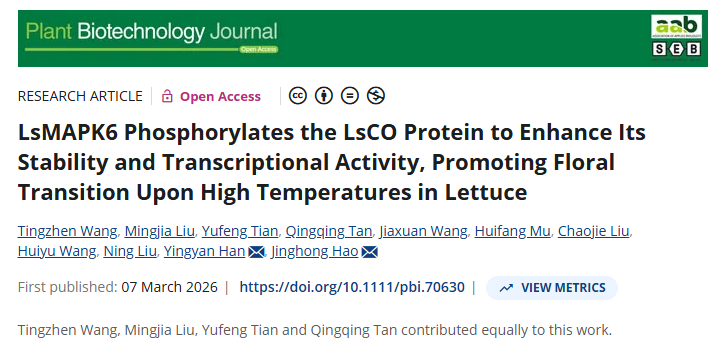 近日,美加墨世界杯官网植物科学技术学院韩莹琰/郝敬虹教授团队在国际知名学术期刊Plant Biotechnology Journal在线发表了题为“LsMAPK6 Phosphorylates the LsCO Protein to Enhance Its Stability and Transcriptional Activity, Promoting Floral Transition Upon High Temperatures in Lettuce(LsMAPK6磷酸化LsCO提高其蛋白稳定性和转录活性促进叶用莴苣高温下成花转变)”的研究论文。该研究揭示了高温诱导生菜抽薹的核心信号模块及其分子机制,不仅深化了对植物整合环境温度信号与发育时序的理解,更为分子设计育种培育耐热、晚抽薹生菜品种提供了关键的理论基础与潜在靶标。