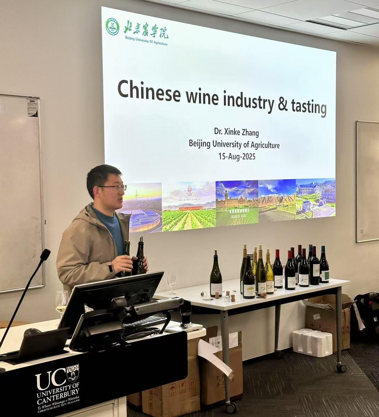 为进一步推动中外文化交流,展示中国葡萄酒的独特魅力与发展成就,8月15日,由中国驻新西兰克赖斯特彻奇总领事馆指导、坎特伯雷大学学联与UC Wine Club联合主办的“品味中国·葡萄酒文化交流”活动在新西兰坎特伯雷大学顺利举行。葡萄酒酿酒师、葡萄酒爱好者40余人现场参加活动。在新西兰访学的食品科学与工程学院副教授张欣珂应邀作为主讲嘉宾,以“Chinese Wine Industry & Tasting”为题进行分享。