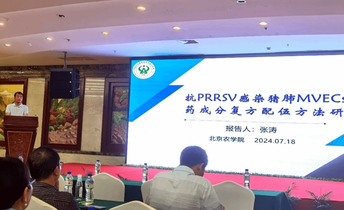 中兽医学分会理事长、世界杯官网动物科学技术学院穆祥教授在大会上致开幕词,张涛教授主持中兽医药现代研究分会场,并和穆祥教授在大会中分别作“中兽医药防治疾病的基本原理”和“抗PRRSV感染猪肺MVECs中药成分复方配伍方法研究”的报告,得到与会人员的热烈反响。