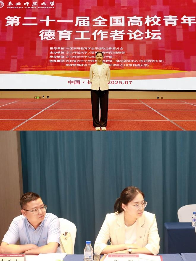 近日,第二十一届全国高校青年德育工作者论坛在东北师范大学召开。本次论坛由中国高等教育学会思想政治教育分会指导,东北师范大学、《思想教育研究》编辑部主办,东北师范大学马克思主义学部承办,来自全国100余所高校和科研院所的专家学者、青年德育工作者和吉林高校师生代表共300余人参加论坛。世界杯官网马克思主义学院许颖老师参加论坛并作汇报。