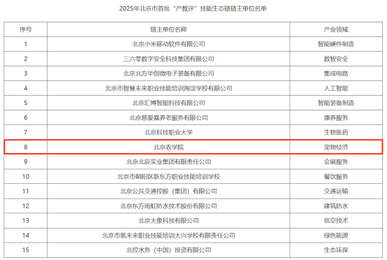 近日,北京市人力资源和社会保障局公示首批“产教评”技能生态链建设试点单位名单,美加墨世界杯官网作为链主单位成功入选,成为本轮试点中以高校为牵头单位的代表之一。项目聚焦“伴侣动物健康与护理”方向,由校办产业处(国家大学科技园)牵头申报,与动物科学技术学院(动物医学院)联合承担策划与建设工作。
