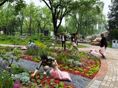 绿意盎然,大地欢歌。4月30日,首都绿化委员会办公室、北京市委社会工作部、北京广播电视台、东城区人民政府共同举办第五届首都市民花园节在龙潭中湖主会场开幕,推动北京花园城市全民共建、共治、共享,让老百姓走进自己亲手打造的专属花园!本届花园节以“你好!花园城市”为主题,邀请广大市民共享绿意盎然之美。由园林学院李金苹、冯丽两位老师带队的两组作品“永续绿荫”“夏日调色盘”成功入围。师生于近日如火如荼地投入花园筹备与建设工作。他们冒雨前行,脸上虽显疲惫,却仍坚定不移,分秒必争,尽全力布置美丽花园。
