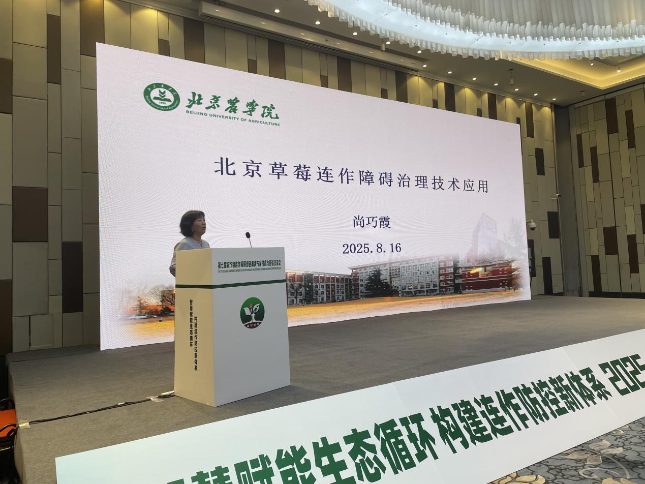 生物与资源环境学院尚巧霞教授在大会上做了题为“北京草莓连作障碍治理技术应用”的专题报告,系统介绍了北京市草莓生产情况和连作障碍主要成因、草莓病毒病害检测及种苗脱毒技术、草莓有害生物绿色防控及连作障碍综合治理技术和成果应用,得到了与会专家的高度评价。