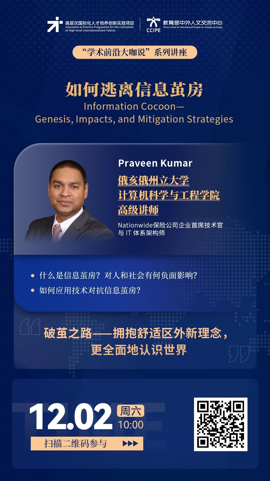 12月2日10:00-11:00,俄亥俄州立大学计算机科学与工程学院高级讲师Praveen Kumar将以“如何逃离信息茧房”为主题,带来兼具知识性与趣味性、本土化与国际化的精彩讲座,欢迎同学们积极报名参加!