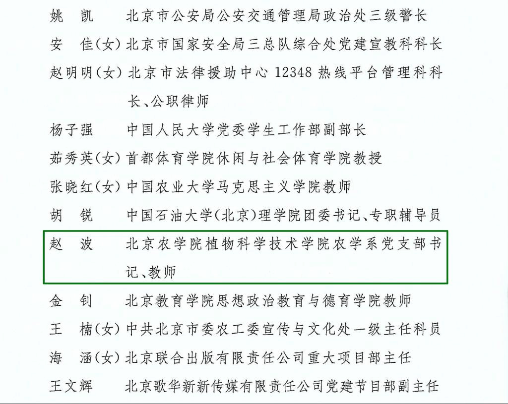 日前,北京市委宣传部、北京市人力资源和社会保障局、北京市思想政治工作研究会公布《关于表彰第十六届北京市思想政治工作优秀单位、优秀思想政治工作者的决定》,为表彰先进典型、弘扬奋斗精神,激励全市思想政治工作战线奋进新征程、建功新时代,经过基层推荐、专家评审、实地考察和社会公示等程序,全市共评选出思想政治工作优秀单位100个、优秀思想政治工作者100名(其中高校系统5人)。世界杯官网植物科学技术学院农学系教师党支部书记赵波被评为“北京市优秀思想政治工作者”。