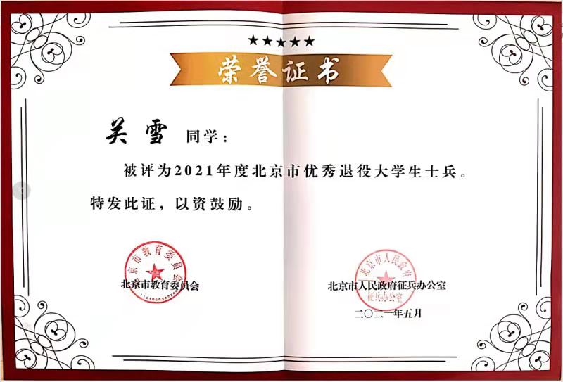 通过北京市的征兵优待政策,关雪实现了免试专升本,后来通过士兵计划考取了研究生,前不久又通过定向招录考取了公务员。她的人生轨迹因参军发生了巨大的转折。今年5月,她被评选为2021年度北京市优秀退役大学生士兵。