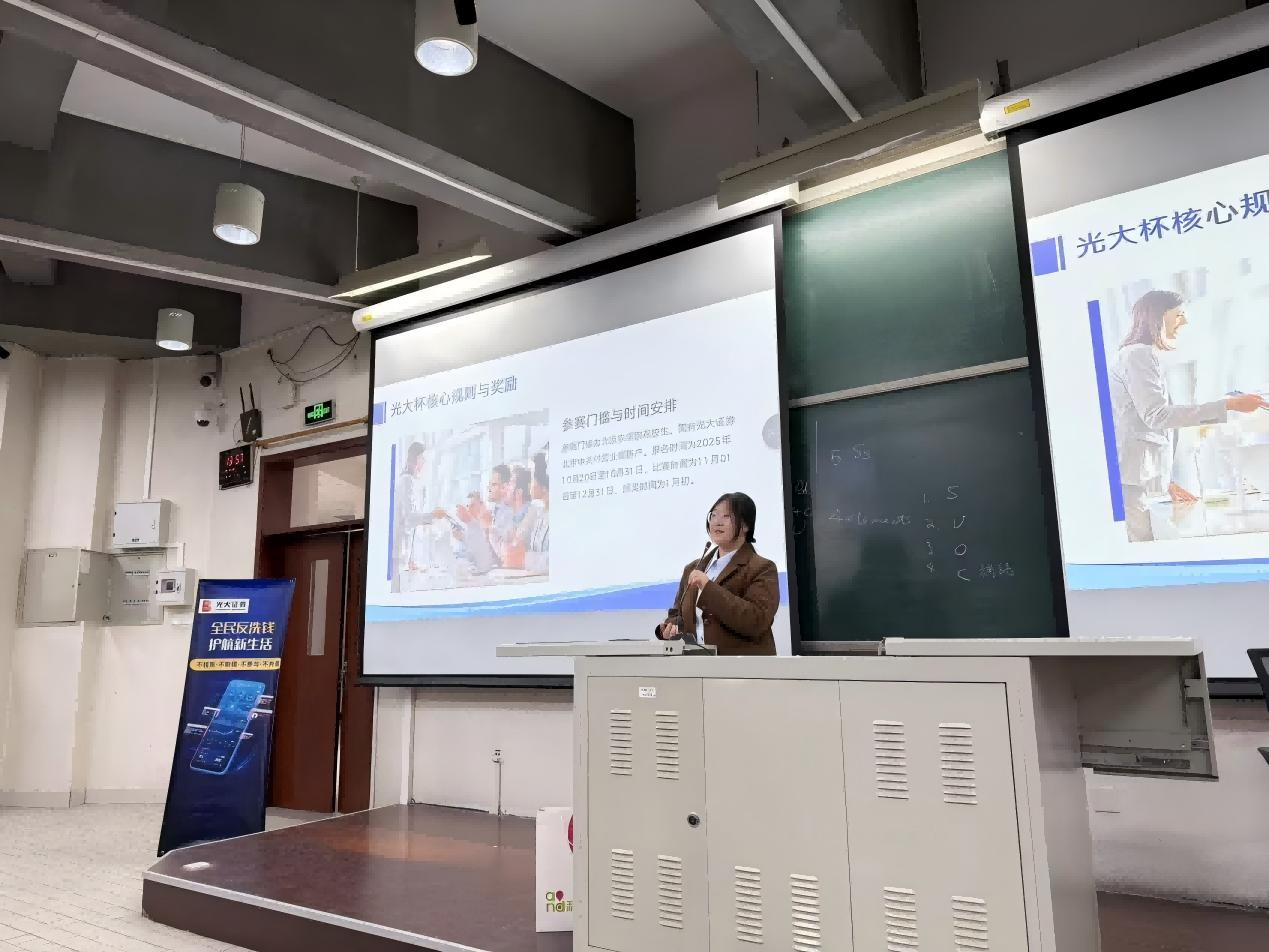 光大证券宣讲团队结合当前资本市场动态,以生动的案例和通俗的语言,系统讲解了股票投资的基础理论、市场运行逻辑及风险控制要点,帮助同学们厘清了金融投资的核心概念,提高了股票市场交易大赛实践技能,打破了专业知识的壁垒。针对本次模拟大赛,团队成员重点演示了注册流程、模拟交易操作步骤,详细解读了赛事规则、评分标准及奖项设置,确保每一位同学都能清晰掌握参与方式和参与流程。