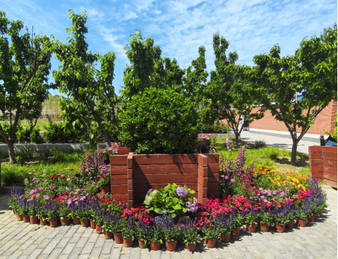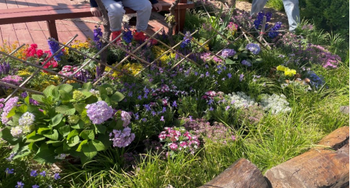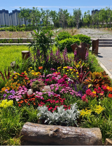 第八组花镜主题为“繁英绮梦”。花镜以丰富多样花卉打造。高低错落植株,色彩斑斓花朵,如粉色、紫色、蓝色等交相辉映,营造出繁花似梦之景。木桩围边质朴自然,与植物融合,增添野趣。中央大型绿植如点睛之笔,提升层次感。整体营造出绮丽梦幻氛围,既展现植物自然之美,又给人带来视觉享受与心灵放松。