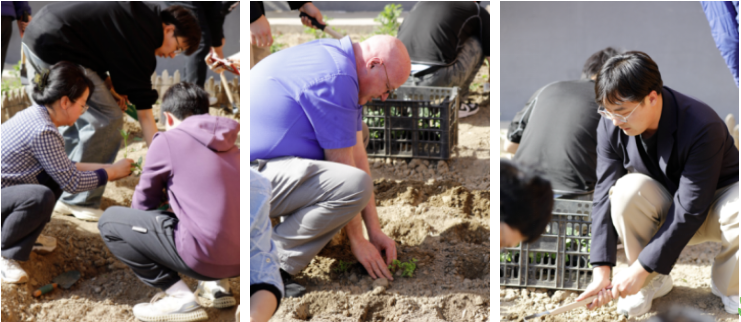 在农艺专家示范下,师生们分组协作,执耒耜、播春种,手指触碰湿润土壤的瞬间,掌纹里嵌入的不仅是春泥的温度,更是在节气律动中找回的生命韵律。在翻涌的新泥气息中体验传统农事智慧,通过松土、播种等劳作建立与土地的深度连接,在躬耕实践中完成了一场静心感知的生命教育。