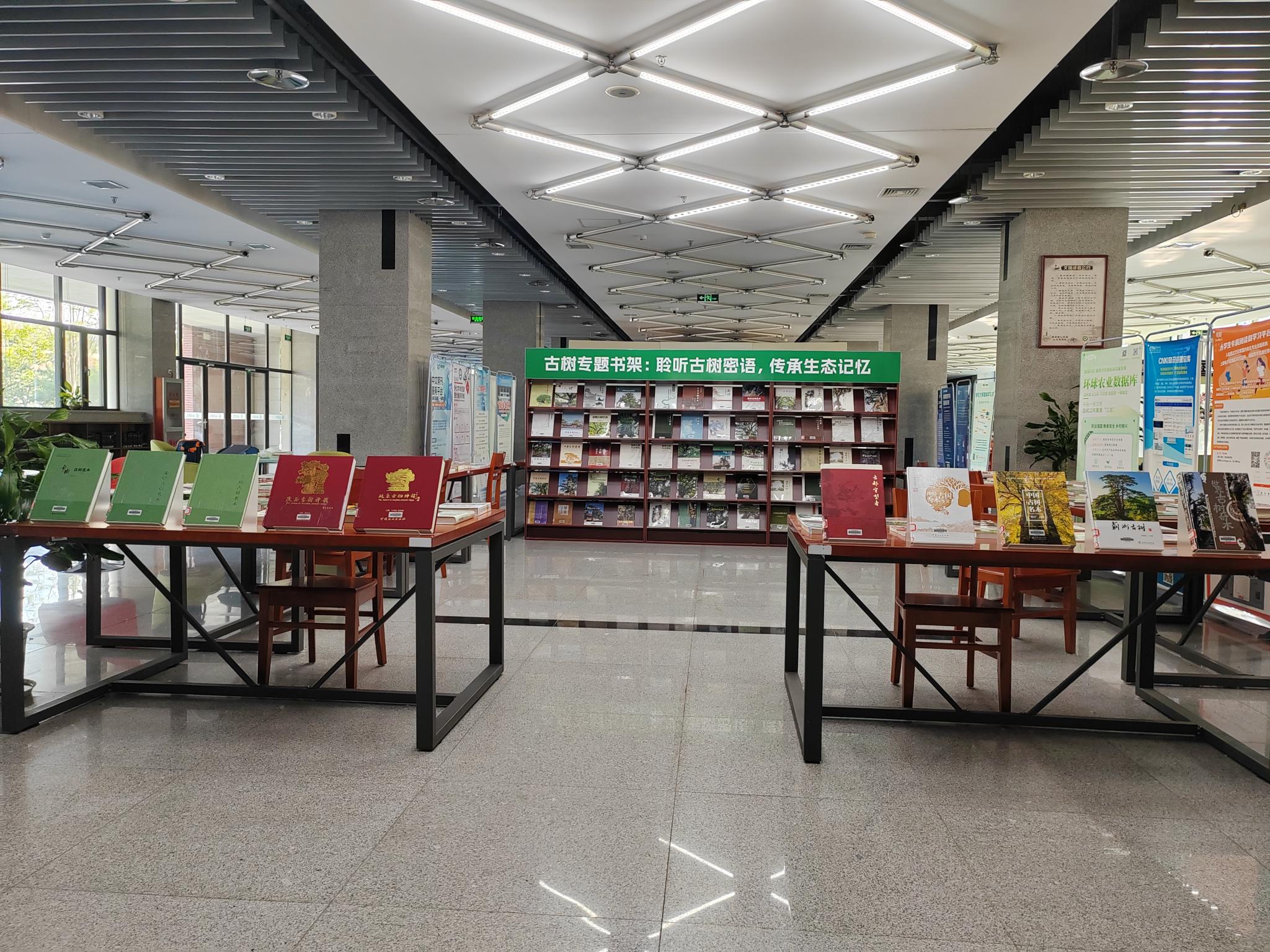 为配合 “树木医生” 微专业开班,4 月 28 日,图书馆精心策划并打造古树专题阅读专区—— “聆听古树密语,传承生态记忆” 。此次古树阅读展区设置在图书馆一层大厅,精选了《中国古树名木》《世界古树奇木》《古树养护与复壮》《古树复壮理论与实践》等大量学术著作,全方位覆盖古树健康评估、病虫害防治、复壮技术等知识领域。师生们漫步书展间,不仅能汲取古树研究与保护的专业知识,更能透过文字感悟古树承载的历史文化与生态记忆,在书香中开启一场与古树的深度对话。