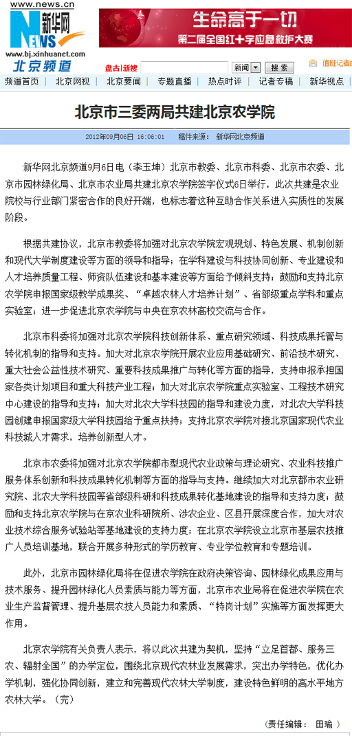 此外,北京市园林绿化局将在促进农学院在政府决策咨询、园林绿化成果应用与技术服务、提升园林绿化人员素质与能力等方面,北京市农业局将在促进农学院在农业生产监督管理、提升基层农技人员能力和素质、“特岗计划”实施等方面发挥更大作用。