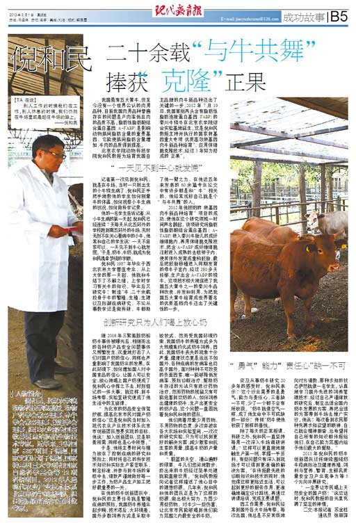 倪和民1987年毕业于西北农林大学兽医专业,从上大学的那一天起,他就和牛结下了不解之缘。上学时学习有关牛的知识,毕业后又研究牛、“制造”牛,二十余载投身于牛的繁殖、生殖、生理以及防御疾病研究,不论从事教学还是做科研,牛都助了他一臂之力,在他近五年来发表的60余篇专业论文中有许多都是和“牛”相关的,他经常戏称自己就是个“与牛共舞”的人。