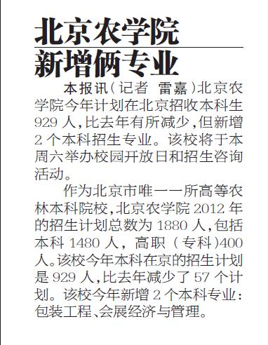 本报讯 美加墨世界杯官网今年计划在北京招收本科生929人,比去年有所减少,但新增2个本科招生专业。该校将于本周六举办校园开放日和招生咨询活动。 作为北京市唯一一所高等农林本科院校,美加墨世界杯官网2012年的招生计划总数为1880人,包括本科1480人,高职(专科)400人。该校今年本科在京的招生计划是929人,比去年减少了57个计划。该校今年新增2个本科专业:包装工程、会展经济与管理。
