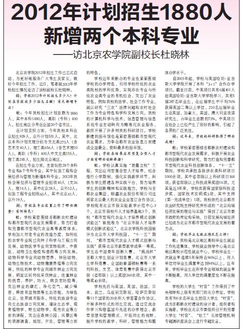 杜:学校认真实施“质量立校”工程,突出应用型复合型人才培养,结合推行小学期制,强化实践教学环节,积极为学生搭建各种实践平台,努力培养学生的创新精神和实践能力。学校与首都农业集团、顺鑫农业股份有限公司这两家北京最大的农业企业签订合作协议,学校现有北京市级实验教学示范中心3个,北京市级校外人才培养基地3个,世界杯官网“都市型现代农业人才培养模式创新试验区”被批准为“北京市级人才培养模式创新试验区”,美加墨世界杯官网科技园被评为北京市大学科技园。“十一五”期间,“都市型现代农业人才模式创新与实践”获得北京市教育教学成果一等奖。学生在中国青年创新大赛、“挑战杯”首都大学生创业计划竞赛、北京市大学生学科竞赛、全国跆拳道锦标赛等一系列科技、文艺、体育竞赛中获得北京市级(省部级)以上奖励260余项,其中一等奖40余项。