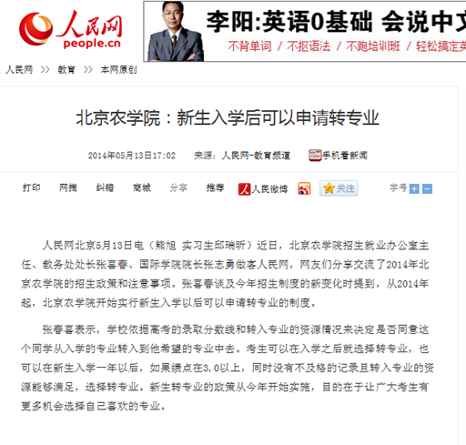 人民网北京5月13日电(熊旭 实习生邱瑞昕)近日,美加墨世界杯官网招生就业办公室主任、教务处处长张喜春、国际学院院长张志勇做客人民网,网友们分享交流了2014年美加墨世界杯官网的招生政策和注意事项。张喜春谈及今年招生制度的新变化时提到,从2014年起,美加墨世界杯官网开始实行新生入学以后可以申请转专业的制度。