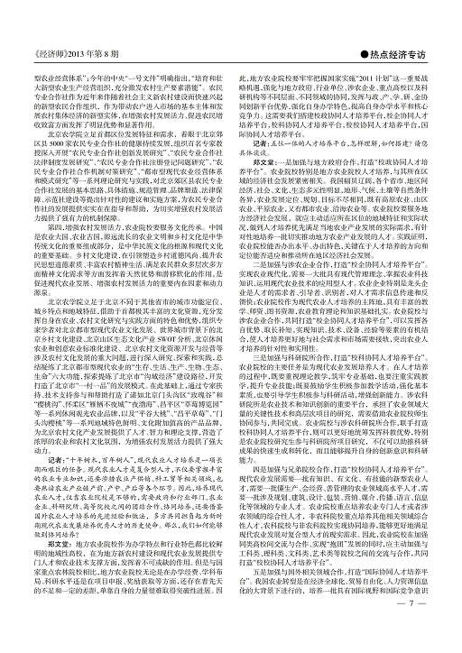 加快首都城乡发展一体化进程,人才至关重要。培养首都城乡发展一体化人才,需要充分发挥高等农业院校与政、产、学、研、金等各个领域的“立体协同”平台作用,需要政府、企业、高校、科研院所及社会各界应共同承担起这一时代重任,为首都率先在全国形成城乡发展一体化新格局而共同努力。