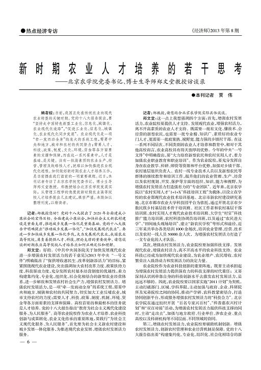 记者:郑教授您好!党的十八大提出了2020年全面建成小康社会的宏伟目标。全面建成小康社会,加快社会主义新农村建设是重要支撑,推进城乡发展一体化是重要基础。党的十八大报告中明确提出“推动城乡发展一体化”,“加快发展现代农业”。要进一步加快城乡发展一体化步伐,大力发展现代农业,我国农业高等院校,肩负着提供人才、科技、理论支撑的重要使命。请您谈谈新时期农业高等院校人才培养应如何正确定位和理解。