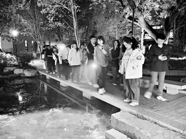 19时许,夜幕降临。授课教师任利利带着40余名学员利用各种夜观设备,了解昆虫的奥秘。课前10分钟,任利利一边招呼学员架设灯诱设备,一边耐心地帮大家复习知识点:“此前的课上我们讲到了,一部分昆虫有趋光性,因为它们的视网膜上有一种色素能吸收紫外光,当感受到光亮时,就会朝着亮处飞去。这个广场有梅园、林沼和樱花步道,一旁的池塘里还种植着40多种水生植物,这样的环境很适合大家夜观昆虫。”任利利打开一盏诱虫灯,挂到灯诱帐篷的最顶端,一些小虫子扑扇着翅膀,成团飞过来。学员们也聚集到帐篷四周,探着头仔细观察。
