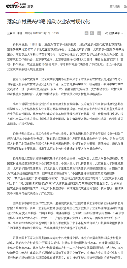 正值全国上下深入学习贯彻落实党的十九大精神之际,本次论坛紧密围绕“落实乡村振兴战略,推动农业农村现代化”开展深入研讨,并就农业供给侧结构性改革、京津冀协同发展、集体产权制度改革、北京市农业结构调整与农村一二三产融合发展等问题形成广泛共识。本次论坛给国内新农村建设与相关领域研究搭建了良好的交流平台,对推动农业农村现代化与乡村振兴战略的理论研究与实践探索具有重要意义,有力推进了新农村建设领域前沿研究的开展。