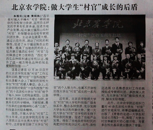 本报讯(记者 滑经纬)“昌平崔村镇大辛峰村‘村官’柳明娟依托母校智力资源,运用自主研发的苹果有机营养液,促进当地产业发展;延庆康庄镇西山沟村‘村官’孙智慧借助母校专家顾问团优势,主动承包蔬菜大棚,通过示范作用,调动了村民的积极性,促进了永宁镇设施农业的发展,提高了当地农民的收入;延庆康庄镇西红寺村‘村官’马剑锋通过努力使特色‘西红寺’西瓜品种顺利通过有机认证,提升了这一地方特色品种的知名度和附加值……”