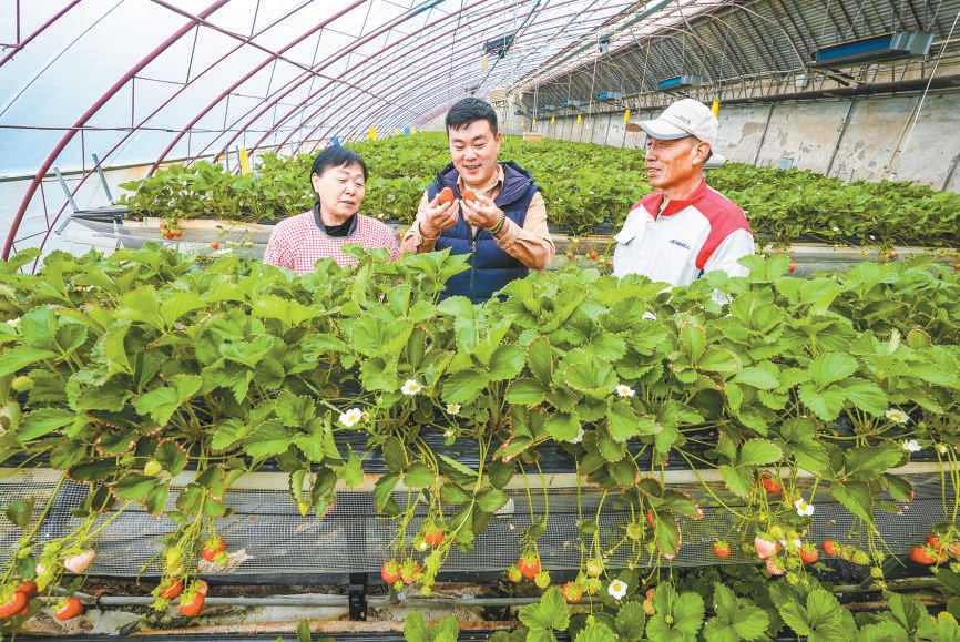 “头雁”崔天鋆(中)与农户讨论草莓种植 本报记者 武亦彬摄
