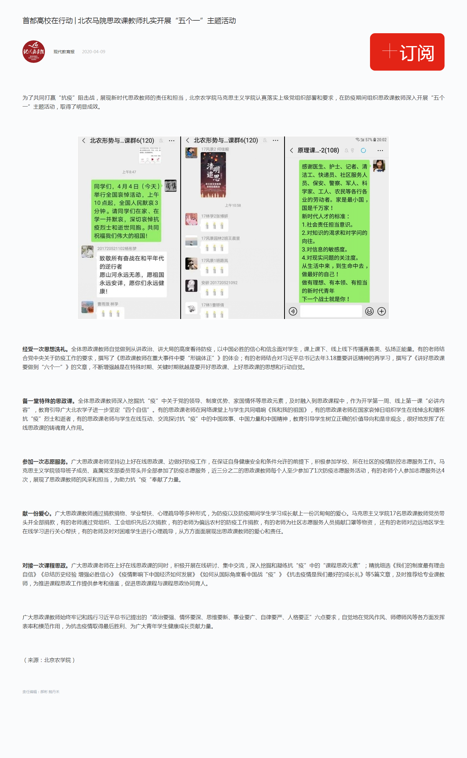 备一堂特殊的思政课。全体思政课教师深入挖掘抗“疫”中关于党的领导、制度优势、家国情怀等思政元素,及时融入到思政课程中,作为开学第一周、线上第一课“必讲内容”,教育引导广大北农学子进一步坚定“四个自信”。有的思政课老师在网络课堂上与学生共同唱响《我和我的祖国》,有的思政课老师在国家哀悼日组织学生在线悼念和缅怀抗“疫”烈士和逝者,有的思政课老师与学生在线互动、交流探讨抗“疫”中的中国故事、中国力量和中国精神,教育引导学生树立正确的价值导向和是非观念,很好地发挥了在线思政课的铸魂育人作用。