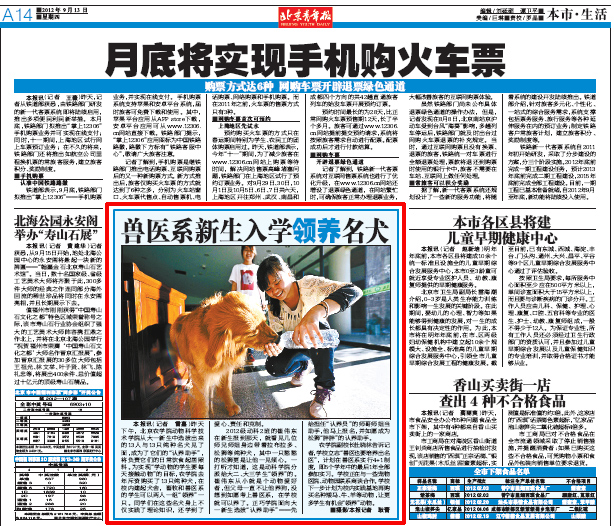 2012级动科2班的崔伟东在新生报到那天,就看见几位师兄师姐身边带着拉布拉多、松狮等纯种犬,其中一只憨憨的松狮更是让他一见倾心。一打听才知道,这是动科学院分派给大二、大三学生“领养”的。崔伟东从小就是个动物爱好者,但父母一直不让他养狗,没想到如愿考上兽医系,在学校就可以养了。正巧学院面向大一新生选拔“认养助手”——先给担任“认养员”的师哥师姐当助手,他马上报名,并如愿成为松狮“胖胖”的认养助手。