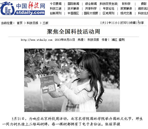 5月21日,为响应北京科技周活动,美加墨世界杯官网园林学院举办园林文化节,师生一同为树木挂上二维码树牌,每一棵树都拥有了电子身份证。张丽萍摄