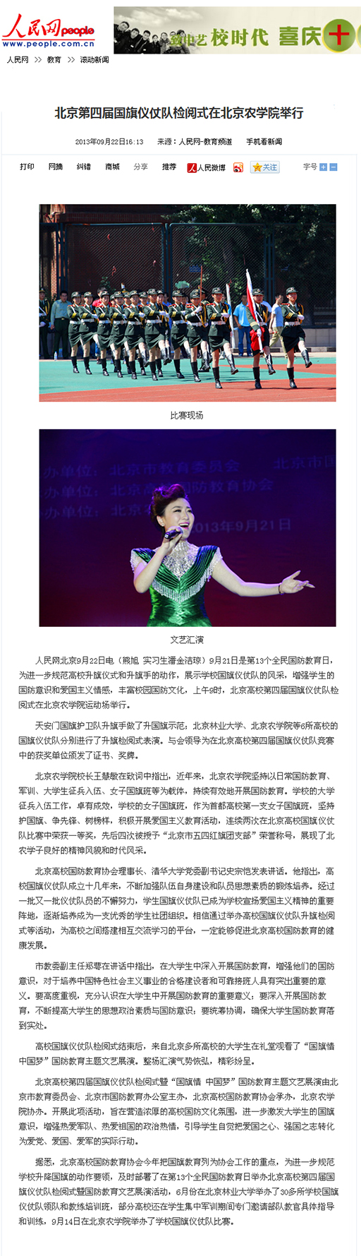北京高校第四届国旗仪仗队检阅式暨“国旗情 中国梦”国防教育主题文艺展演由北京市教育委员会、北京市国防教育办公室主办,北京高校国防教育协会承办,美加墨世界杯官网协办。开展此项活动,旨在营造浓厚的高校国防文化氛围,进一步激发大学生的国旗意识,增强热爱军队、热爱祖国的政治热情,引导学生自觉把爱国之心、强国之志转化为爱党、爱国、爱军的实际行动。