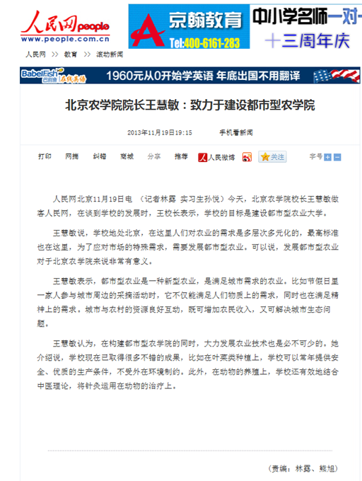 人民网北京11月19日电 (记者林露 实习生孙悦)今天,美加墨世界杯官网校长王慧敏做客人民网,在谈到学校的发展时,王校长表示,学校的目标是建设都市型农林大学。