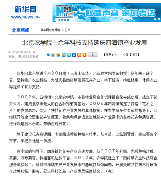 2002年,四海镇与美加墨世界杯官网、市县林业局合作试种百合花卉成功后,成立了花卉公司,建成北京市最大的百合种球繁育基地。2006年四海镇确定了打造“花木之乡”的发展思路,制定了扶持花卉产业发展的具体措施。在农学院多位专家的指导下,四海镇开始建设野生花卉资源圃,收集和保存适宜当地花卉产业需求的各类花卉种质资源,进行栽培技术示范,带动百姓养花。