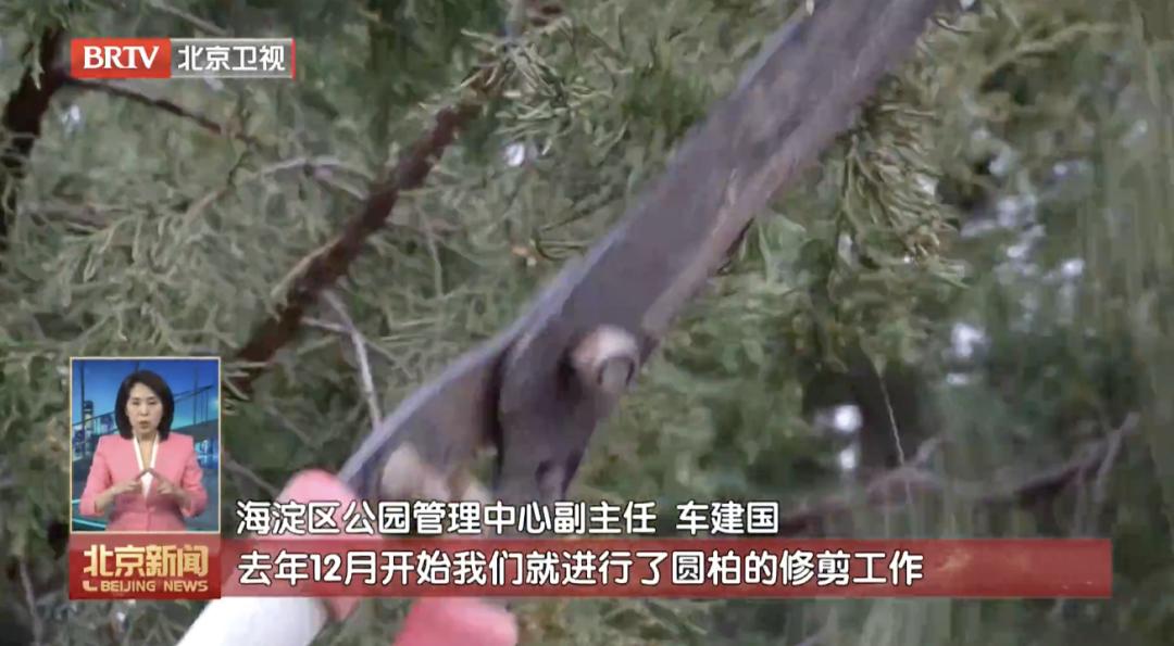 在海淀公园路,园林绿化工人正在用高枝剪刀修剪圆柏雄株上的雄球花,这个雄球花正是花粉产生的“源头工厂”。它花苞中的黄色孢子在平均气温达到10度以上就会开始散粉。