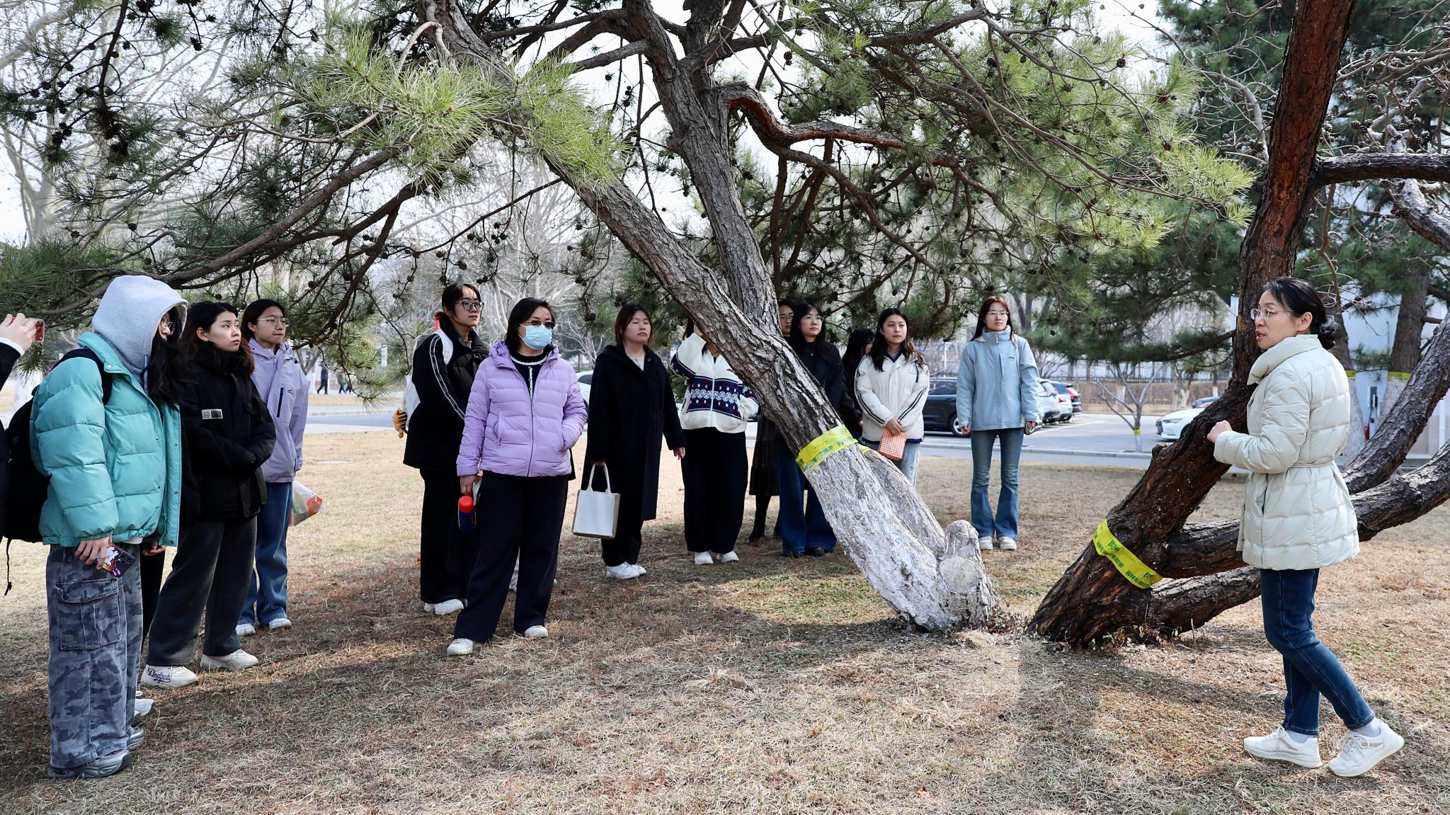 在学校礼堂前,一场“识树医木”活动正在进行。学校植物健康研究院的赵晓燕教授、任争光副教授、何李迁副教授带领同学们逐一“问诊”路边的树木。在一棵松树前,老师轻轻剥开一块树皮,向同学们示意:“这里有蛀干害虫的痕迹。病虫害防控的关键在于‘早发现、早诊断’。”老师们将专业知识转化为通俗易懂的语言,从树木的生长特性讲到生长周期,从适宜环境讲到养护技巧。同学们则凑上前去仔细观察、拍照记录。“听了今天的课才发现,每一棵树都有自己的‘脾气’,作为植物保护专业的学生需要深入了解树木,才能更好地养护好它们。”