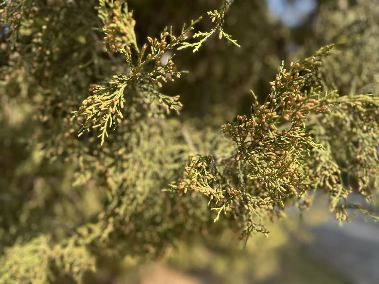 圆柏是高大的常绿乔木,多雌雄异株。雌株通体青翠,其球花为灰绿色,不飞粉;雄株则长着黄色的小孢子叶球结构,一旦成熟便会开裂,是花粉的“源头工厂”。一棵成年圆柏产生的花粉数量或以十亿计,且直径只有20—30微米,相当于头发丝的三分之一,可以长时间悬浮在空中。在社交媒体的一些视频中,让“过敏星人”闻风丧胆,如沙尘暴般的“花粉雾”就是这样形成的。
