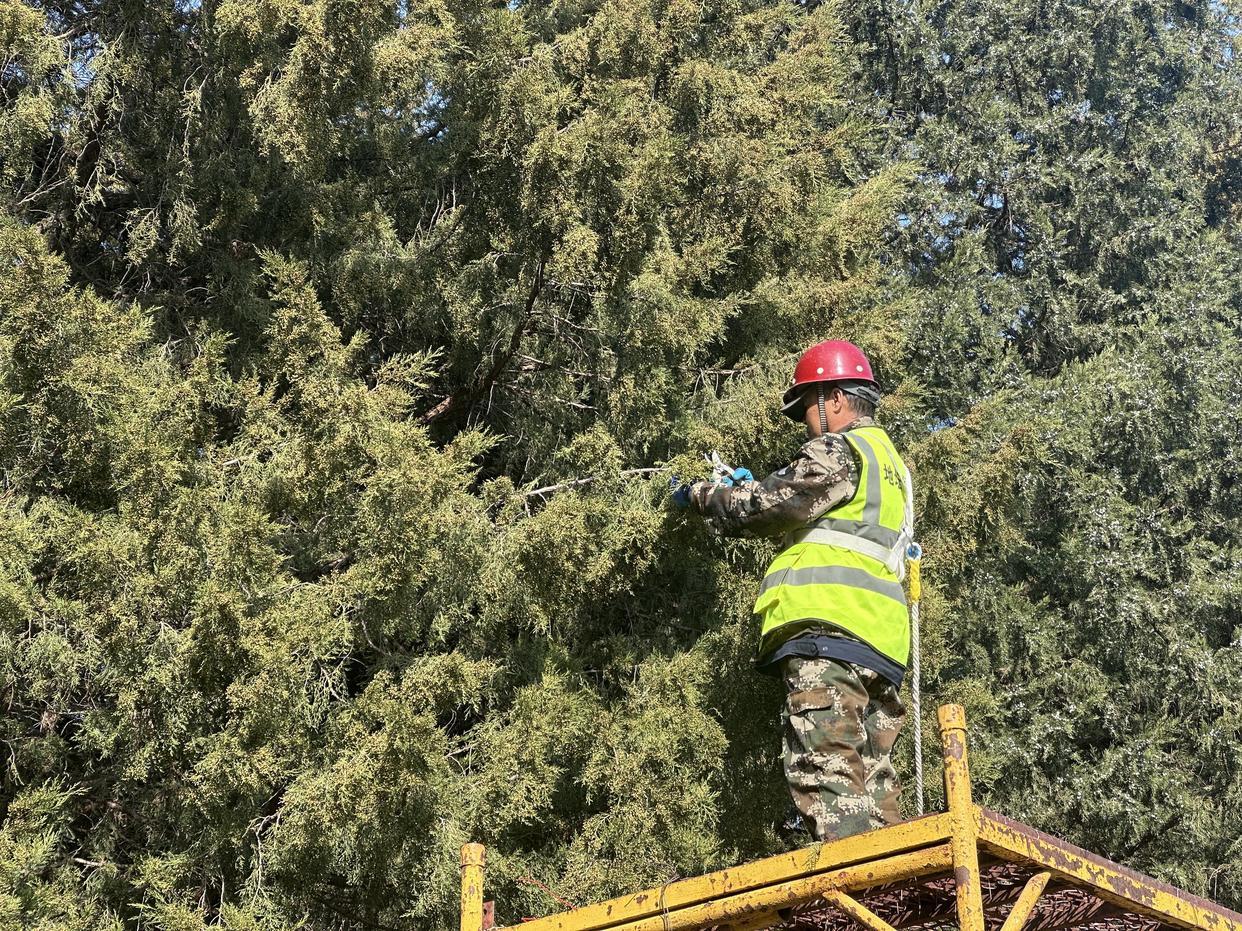 近日,在北京地坛公园,园林绿化人员正对圆柏雄球花枝条整形修剪,高压喷水和地面湿化等加速花粉沉降、降低局部浓度的措施也在同步进行。地坛公园副园长刘洋介绍,在花粉季,公园会结合圆柏的生长特性,定期为其“剪发”和“洗发”。