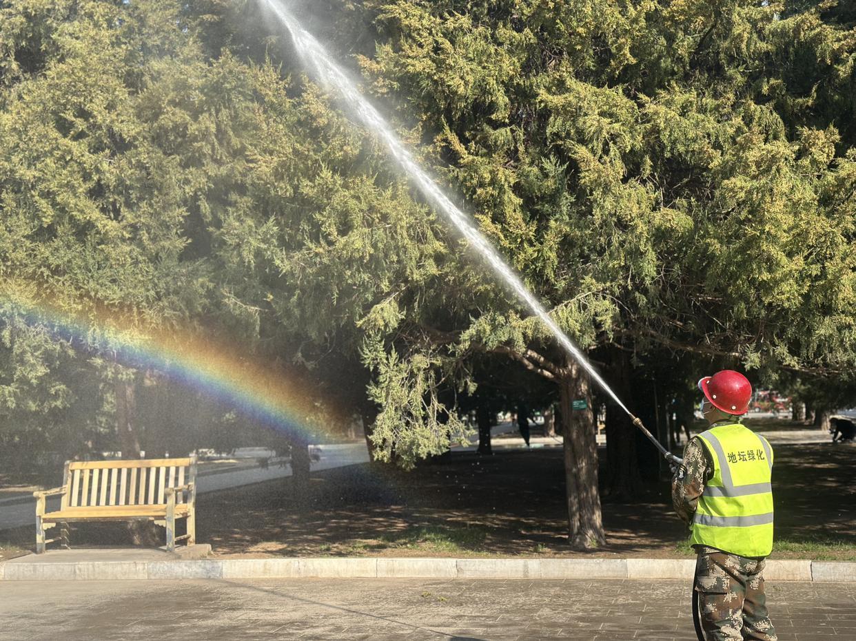 △北京地坛公园,园林绿化人员用添加了花粉固定剂的水为圆柏“洗发”。