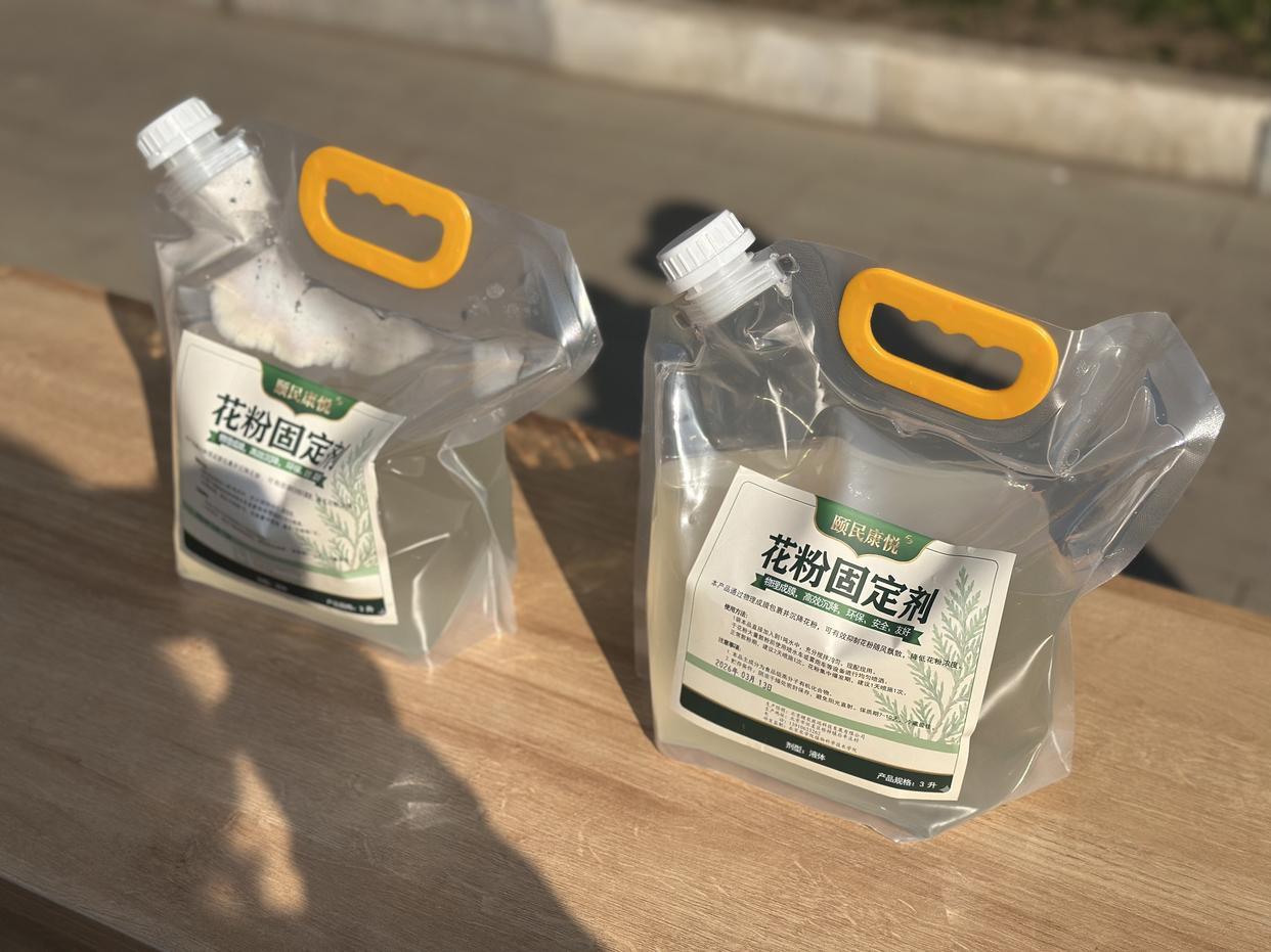 △一袋花粉固定剂配比一吨水进行稀释和喷施。
